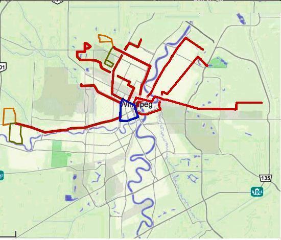 By splitting Transcona in two along Kildare, we acheive the maximum pickup frequency with a single route.. The city presently spreads out its service between Regent, Kildare, and McMeans, but the effect is often to trade at most a ten-minute walk (our plan) for a five-minute walk plus a twenty-minute wait (the present system). We have twenty busses on this route running five minutes apart, for an average wait of 2.5 minutes.