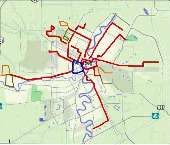 St Vital is a bit of a tough case because its width mushrooms from the primary access point at the corner of St Mary's and St Annes. In this plan I've designated the major collector route as Ste Anne's Road, with interior neighborhoods served by feeder routes. Fourteen busses are needed to provide pickups every five minutes.
