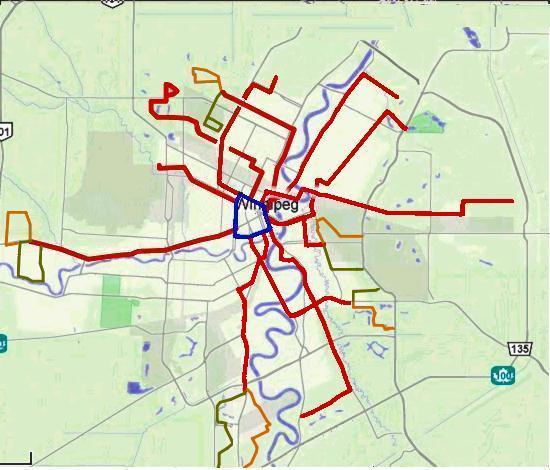 The Pembina Highway bus route splits in two at University Crescent. One half covers Waverly Heights and the other branch goes to Fort Richmond. These are neighborhood routes. The University traffic is handled by a special express shuttle: four busses running every three minutes nonstop between the campus center and the junction of Pembina and University Crescent. The Pembina route itself needs twenty-four busses to maintain five minute service to downtown. Because the Pembina bus branches into the neighborhoods at University Crescent, traffic on Pembina Highway south of that junction is covered by the St Norbert regional feeder.